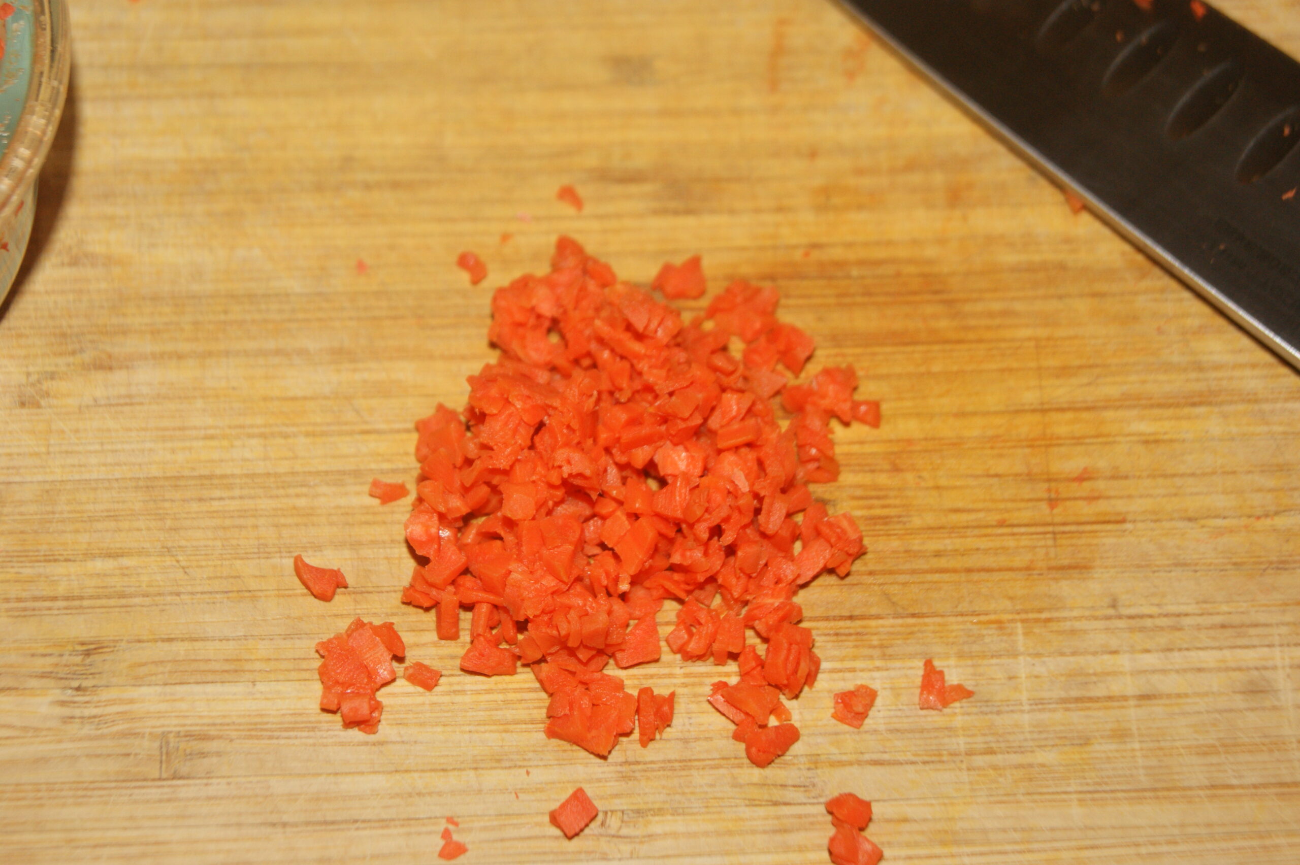 Fill the 4-quart pot with 2-3/4 cup of water. Set the strainer in the pot. Place on the stove and turn on HI. As the water is heating cut and dice carrots with a knife on the cutting board into small chunks, about the size of a pea. Dump the carrots on top of the strainer. Cover and bring to a boil. You will not need to stir the carrots. Steam for approximately 10-15 minutes. Check for tenderness.