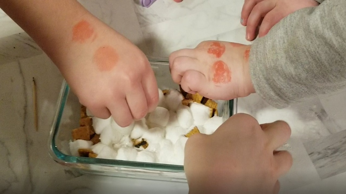 Put the grahams in the dish and spread evenly. Put the marshmallows over the grahams. Put the chocolate chips on and spread evenly. Put in the microwave for 20 seconds. Use a pot holder to remove. Enjoy with your family!!